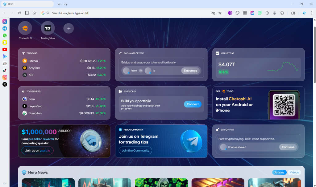 Install Hero Browser and open the Chatoshi panel to explore. Ask about any token or project, check crypto news, see influencer opinions, review technical analysis, or look up blockchain data like transaction hashes without separate scanners.