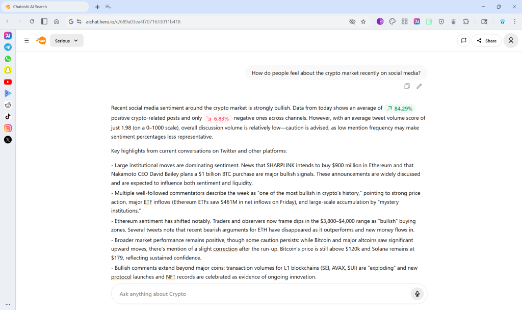 All in one workflow. Users like that Hero brings research, wallet, DEX tools and dapps into one place. It reduces the need to constantly switch between tabs and makes it much faster to move from finding information to taking action. Chatoshi AI works as a crypto focused search layer, allowing users to request token information, live data, influencer opinions, on chain checks and recent news without leaving the page.