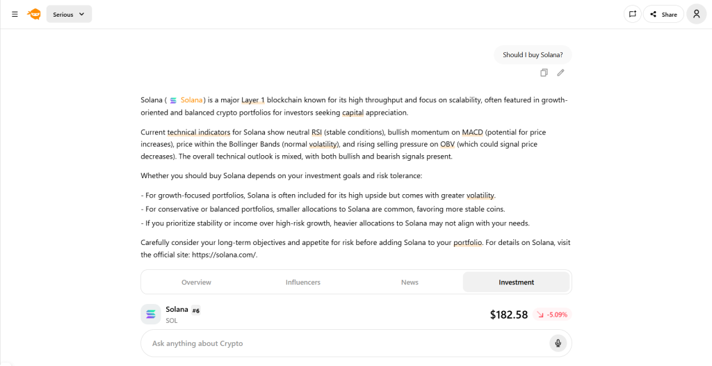Domain depth: Chatoshi AI is built for crypto. It maps tokens, protocols, teams, tokenomics, and governance, finding connections that broad AI tools usually miss.