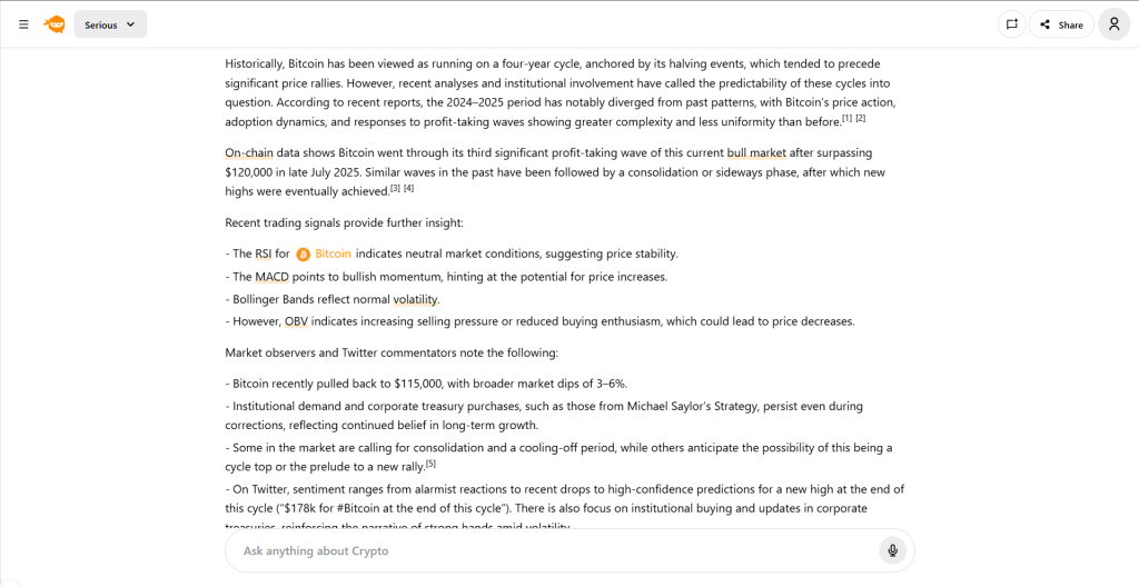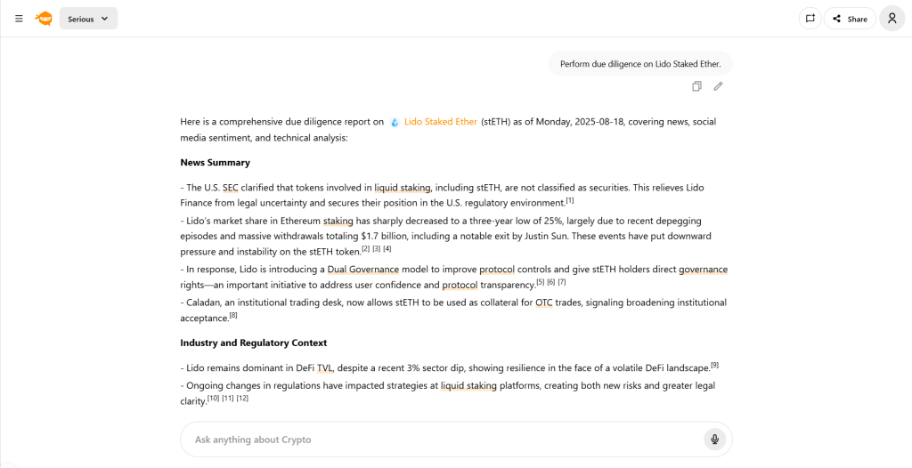 - Insight extraction: It connects price action, liquidity zones, and protocol metrics into clear insights.